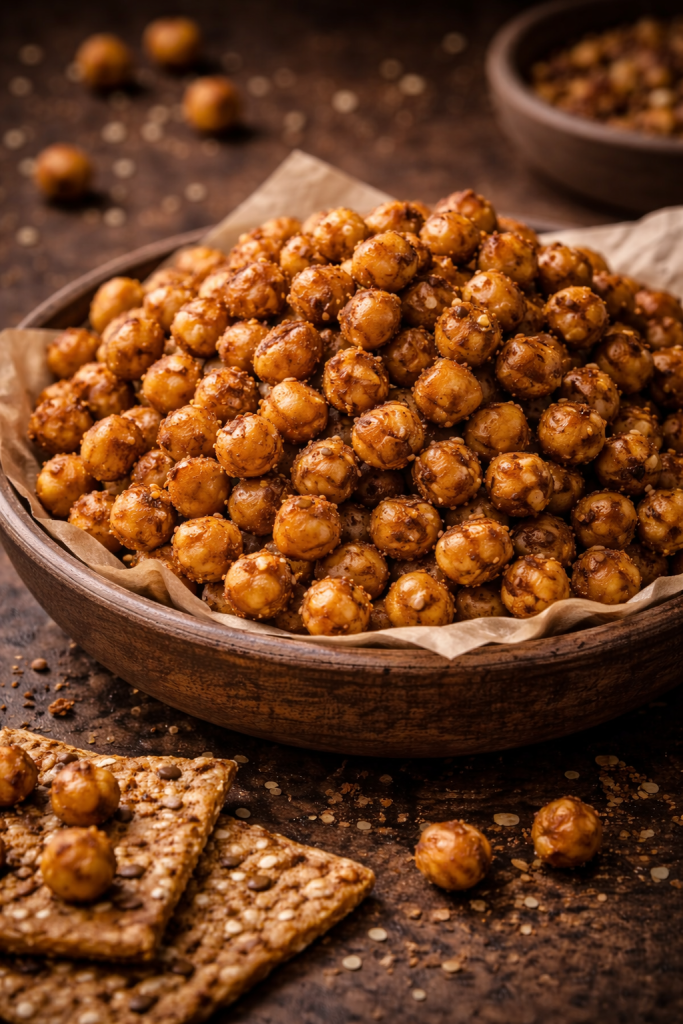 Roasted legumes, such as chickpeas or broad beans, are a crunchy and protein-rich snack option.